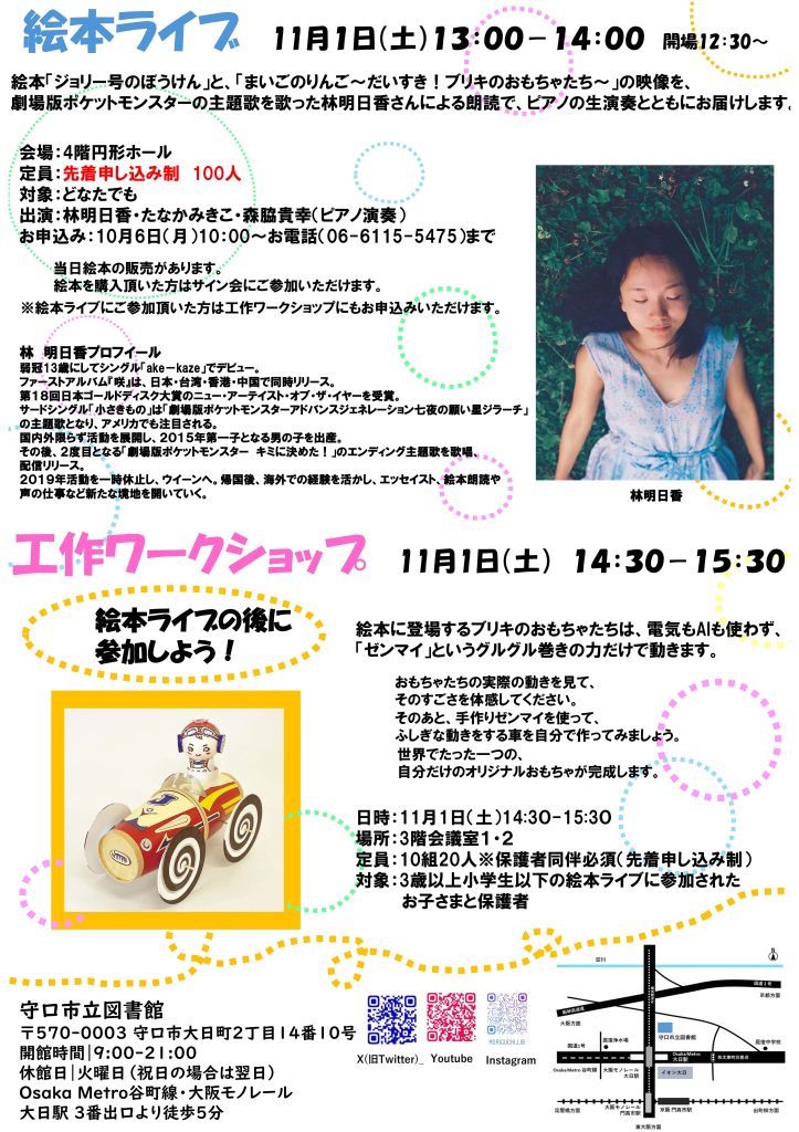 絵本ライブ:絵本「ジョリー号のぼうけん」と、「まいごのりんご~だいすき!ブリキのおもちゃたち~」の映像を、劇場版ポケットモンスターの主題歌を歌った林明日香さんによる朗読で、ピアノの生演奏とともにお届けします。