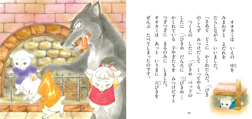 お母さんに留守番をたのまれた、七ひきの子やぎたち。お母さんの言いつけを守り、みんなで力を合わせて悪いオオカミとたたかいますが、うまくいきますよう…。