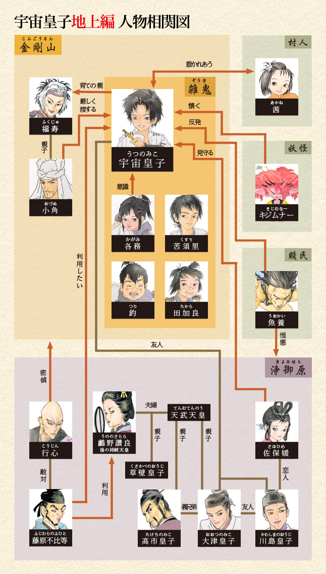 神と人との間に生まれた証として頭に角が生えていた少年は “鬼”や“獣”と蔑まれ、幼いながらに天涯孤独の身となってしまう。 老婆に拾われ、育てられた少年は『宇宙皇子(うつのみこ)』と名付けられた。 様々な人と出会い、そして別れを経験していく中で、 宇宙皇子は壮絶な歴史の流れに翻弄され、悩み、もがき苦しみながらも、 自分の信念をまっすぐに貫き通していく。 |